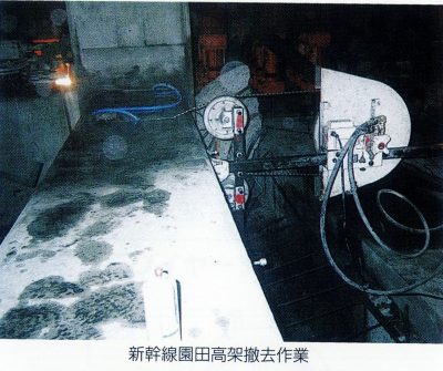 ダイヤモンドワイヤーソー工法は切断対象物にダイヤモンドワイヤーを環状に巻き付け高速移動によって切断する方法で、切断対象物の形状に制約がなく、遠隔操作ができることから、高所・水中構造物・狭い場所等でも作業場所を選ばず大型鉄筋コンクリートの切断解体が安易に行える工法です。