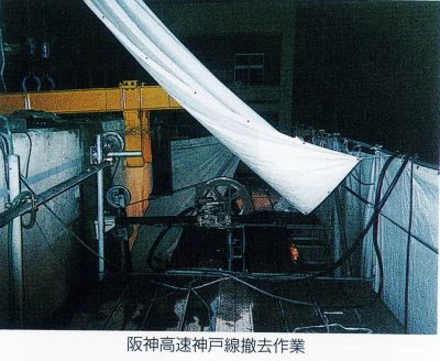 写真は橋梁の新設を行うにあたり季節橋脚をワイヤーソー工法にて切断撤去を行っている状況です。施工計画に基づき、約10T/BL程度に小割切断しクレーンにて積み込み、搬出を行い短期間で工事を完了いたしました。